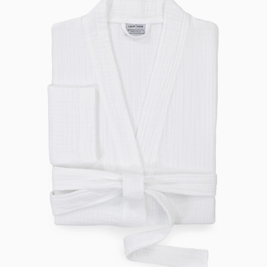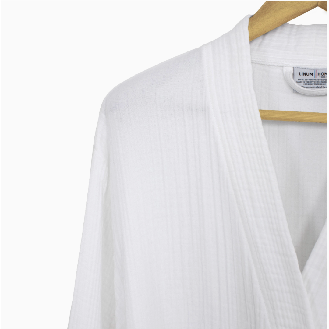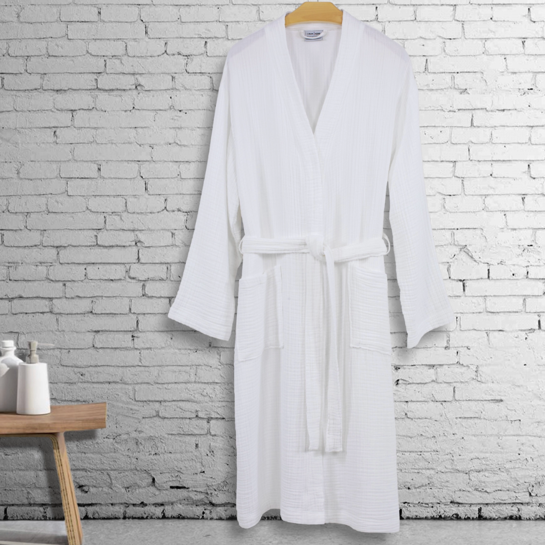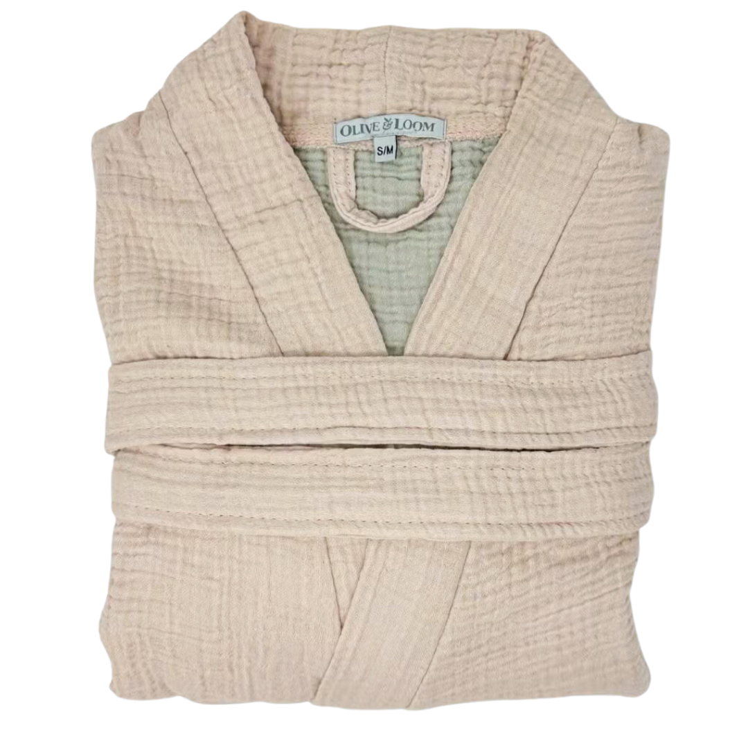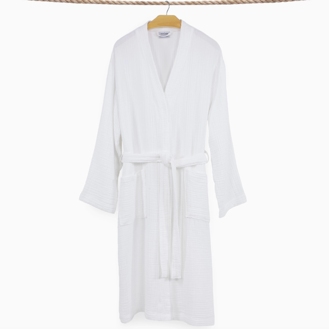 Spa Robe. Wrap yourself in luxury with our 100% cotton robe, crafted from 4-ply gauze and featuring the softest texture of long-staple Turkish cotton. Ideal for drying off after a shower, bath, or pool dip, or simply lounging at home, this robe combines both comfort and functionality. The adjustable waist tie ensures a perfect fit, whether you prefer it snug or loose, while the two convenient side pockets add practicality for carrying essentials. This robe makes the perfect addition to any gift box, gift set, or care package, offering an experience of remarkable softness and lightness that’s designed to be true to size for a perfect fit. S/M is blush. L/XL is white.