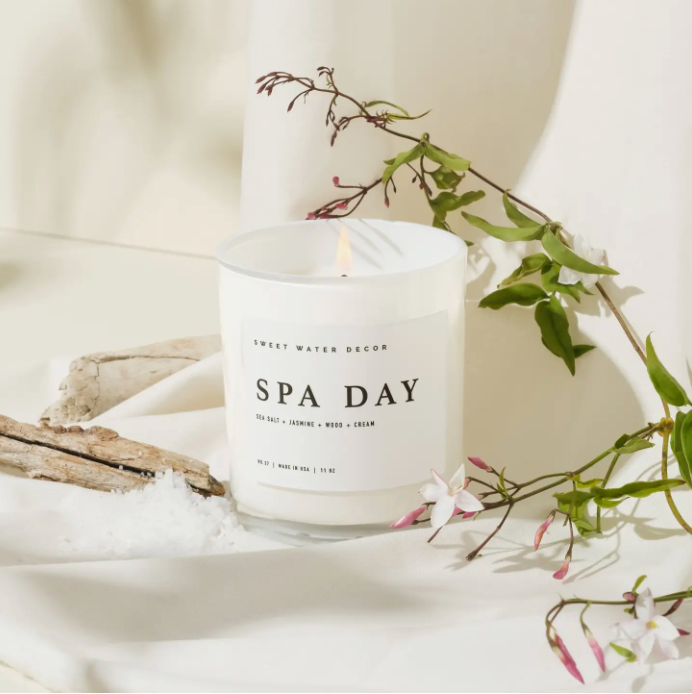 'Spa Day' Soy Candle. Indulge in the ultimate relaxation with our 'Spa Day' candle, an essential part of this luxurious self-care & pampering spa day gift box. Elegantly presented in a white glass jar with a wooden lid, this candle is perfect for Mother’s Day, self-care rituals, or any occasion that calls for tranquility. Scented with a calming blend of sea salt and jasmine top notes, woody middle notes, and a creamy base, it transforms any space into a serene sanctuary. Crafted with a 100% cotton wick and a proprietary soy-based wax blend, this 11oz candle offers over 50 hours of burn time. Vegan, non-GMO, and kosher-certified, it’s also gluten-free, phthalate-free, non-toxic, and cruelty-free. Whether you're unwinding in the bathroom or creating a peaceful retreat, this candle enhances the ambiance and is the perfect addition to any gift box designed to pamper and rejuvenate.